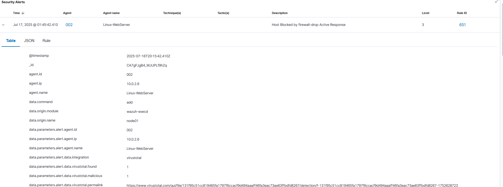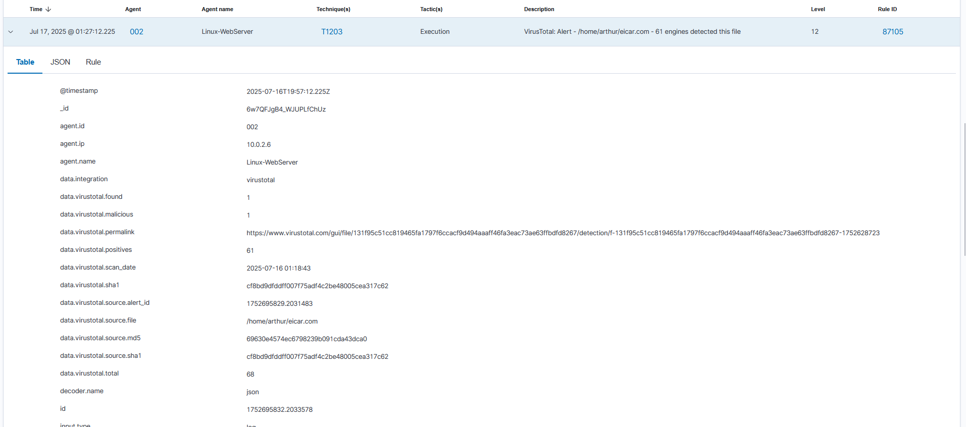 I integrated the Wazuh server with the VirusTotal API. This automatically checks the hash of any new file detected by FIM against VirusTotal's database of known malware, transforming a low-context "File Modified" alert into an actionable, high-confidence "Malware Detected" event.