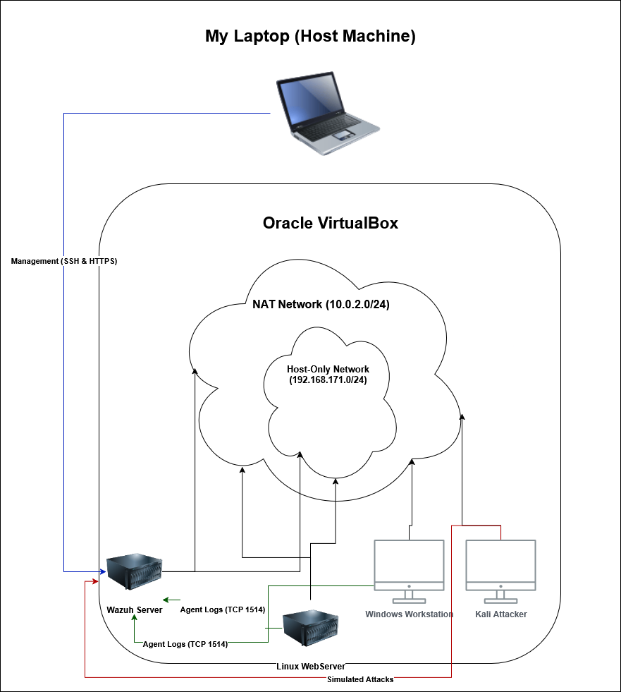 The lab was built using Oracle VirtualBox and consists of four virtual machines on a dual-homed network. The architecture ensures isolation while maintaining management access.