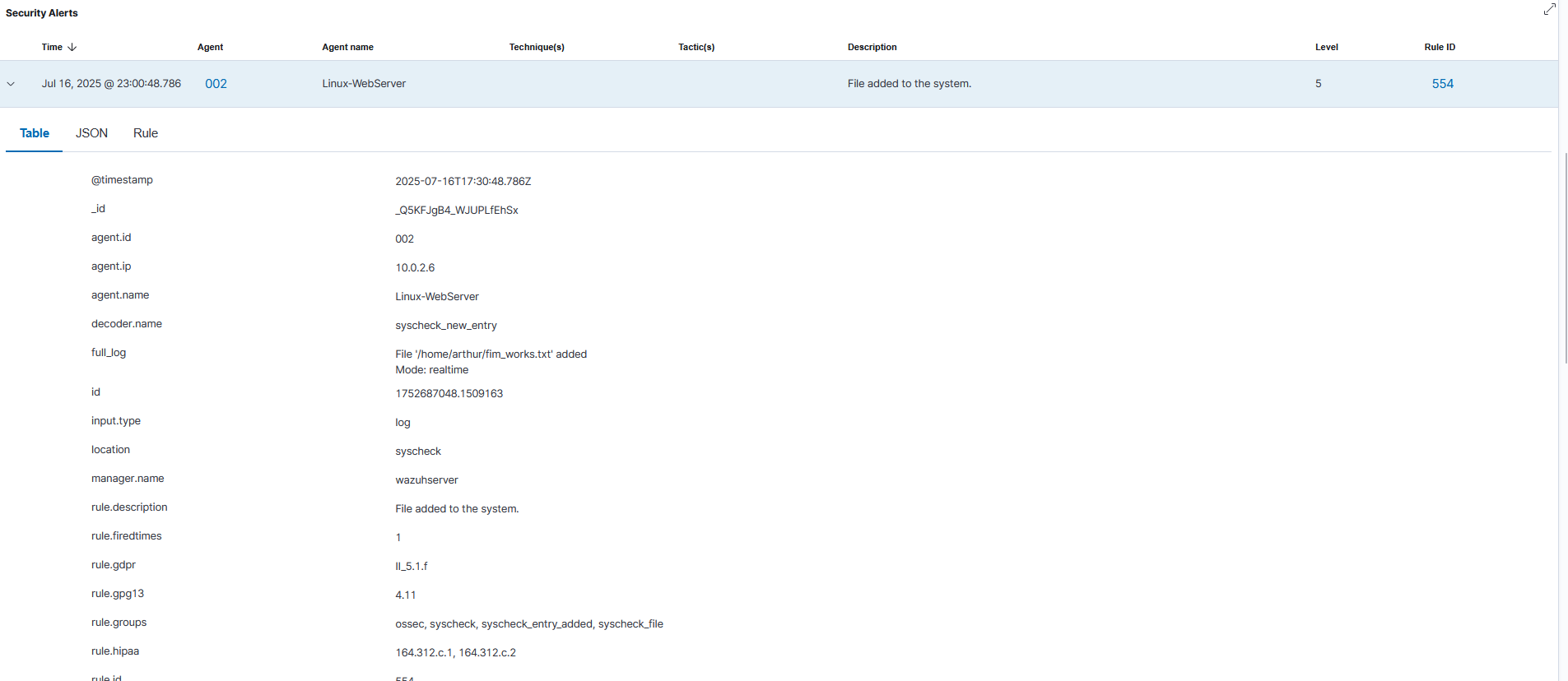 To protect critical assets, I configured File Integrity Monitoring (FIM) to provide instant alerts for unauthorized file modifications. After initial troubleshooting revealed a persistent configuration sync issue, I successfully pivoted to a direct, local configuration on the agent's ossec.conf file to monitor the user's home directory.