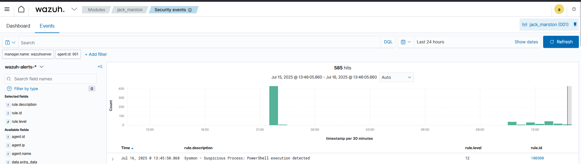 To simulate a high-fidelity detection for a common threat vector, I authored a custom rule to generate a high-priority alert whenever PowerShell was executed.