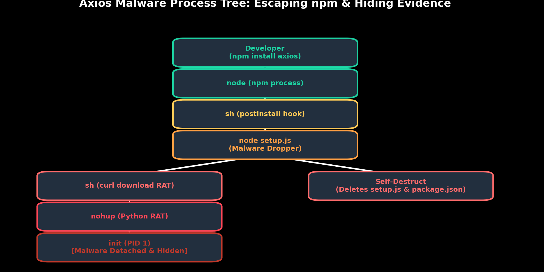 Forensic Evasion: The malware actively detaches itself from the npm install process tree (orphaning itself to PID 1) and then deletes its own source files, making post-infection detection incredibly difficult.