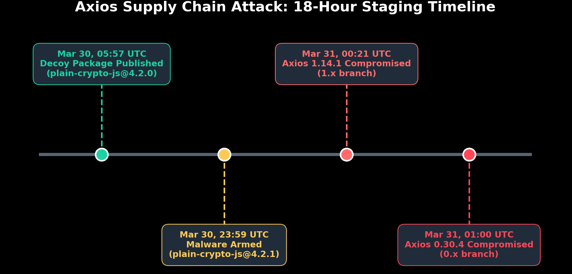 The attackers premeditated the strike by establishing a clean publishing history with a decoy package 18 hours before injecting the malware into the legitimate axios release pipelines.
