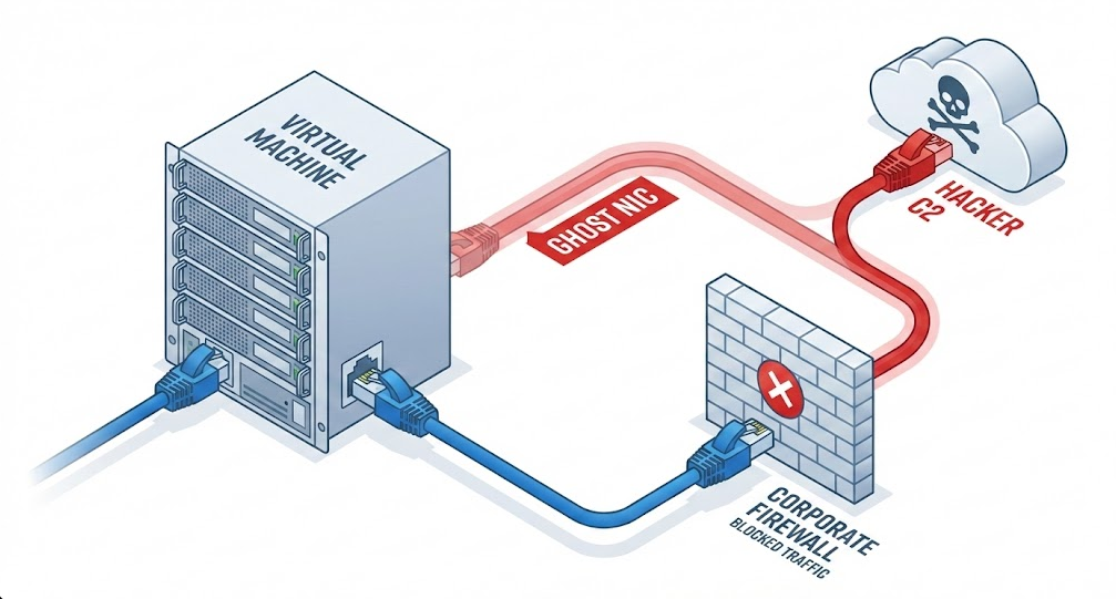 - The Ghost Path: The malicious NIC is bridged to a separate VLAN or directly to the internet, bypassing the corporate firewall entirely.