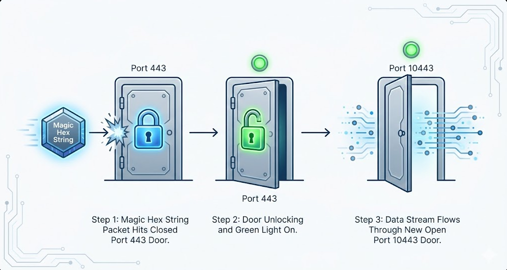- The Knock: The hacker sends a packet to Port 443 containing the "Magic String."